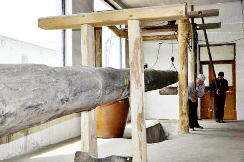 笔者在谭振军的合作社看到,在一个占地一千平方米的宽大厂房内,厂房的边上悬挂着一根长12米、直径0.5米的百年大树木杆,这根木杆就是梁榨胡油的油梁。油梁的前端是几根条形木块,油梁的后端是三个大小各异、重达600斤的石质碌碡。笔者现场看到,工人正在生产,在油梁前端工人用力用铁锤击打条形木块不留缝隙,后端利用机械滑轮吊起石质碌碡重压,利用杠杆原理,把胡麻麻饼压榨出油,胡油从层叠的麻饼中一滴一滴渗出,积少成多,汇成油河流入地下的储藏油坛。若非亲眼目睹此景,很难切身体会物力维艰,吃油不易的道理。